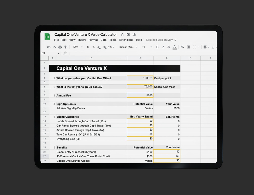 The spreadsheet will automatically calculate the 1st year value of the card, including the sign-up bonus and the card value for the 2,3,4, and 5th years.